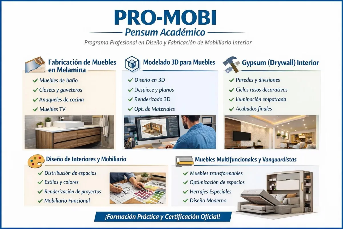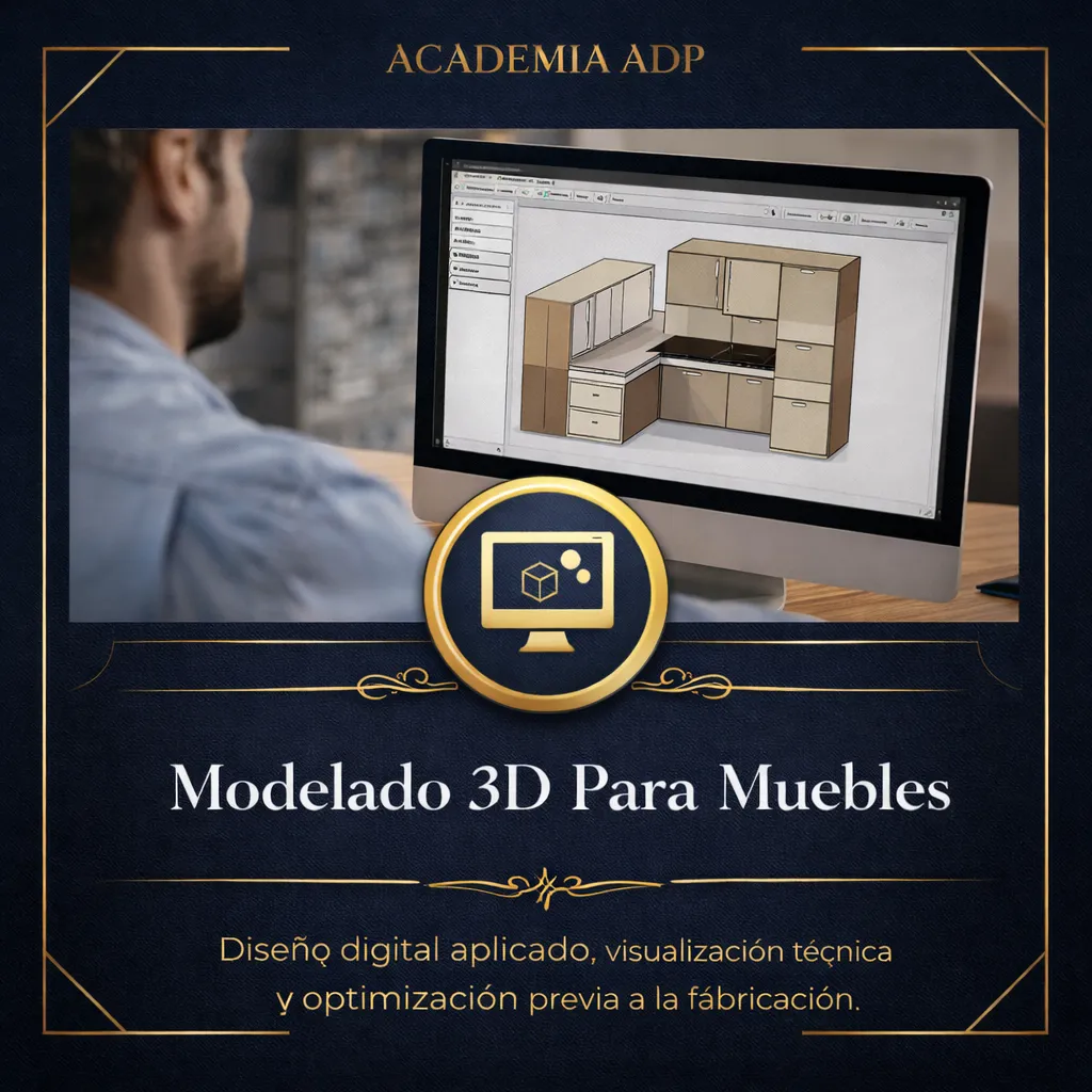 Es un programa de formación técnica integral que combina diseño, modelado 3D y fabricación de mobiliario interior. Está orientado al desarrollo de competencias profesionales mediante una metodología práctica, estructurada y progresiva.